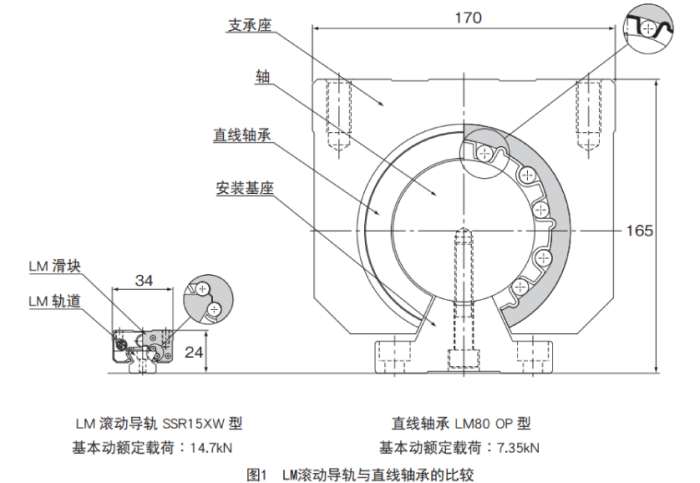 直線導軌將滾動面設計成R槽形狀,使?jié)L珠和滾動面形成“面接觸”。與直線軸承等“點接觸”類型的導向部件相比,直線導軌的容許負荷約為其13倍,直線導軌與直線軸承等“點接觸”的直線導向部件相比,即使容許負荷相同,也可以設計得更加緊湊。
