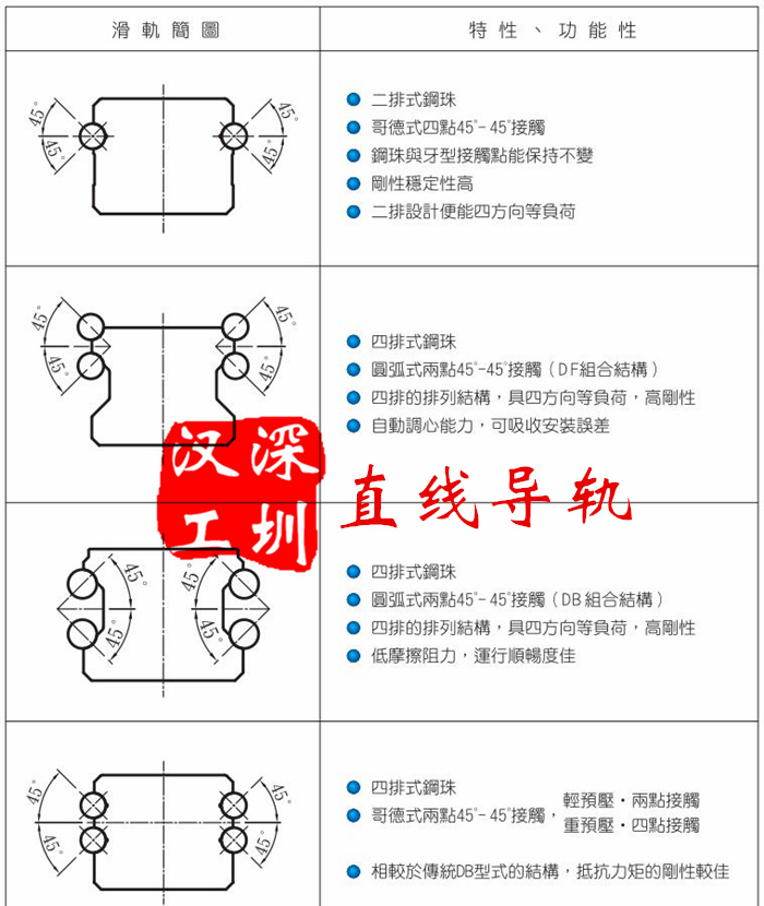 運(yùn)用四列式圓弧溝槽,配合四列鋼珠等45度之接觸角度,讓鋼珠達(dá)到理想的兩點接觸構(gòu)造,能承受來自上下和左右方向的負(fù)荷;在必要時更可施加預(yù)壓以提高剛性。